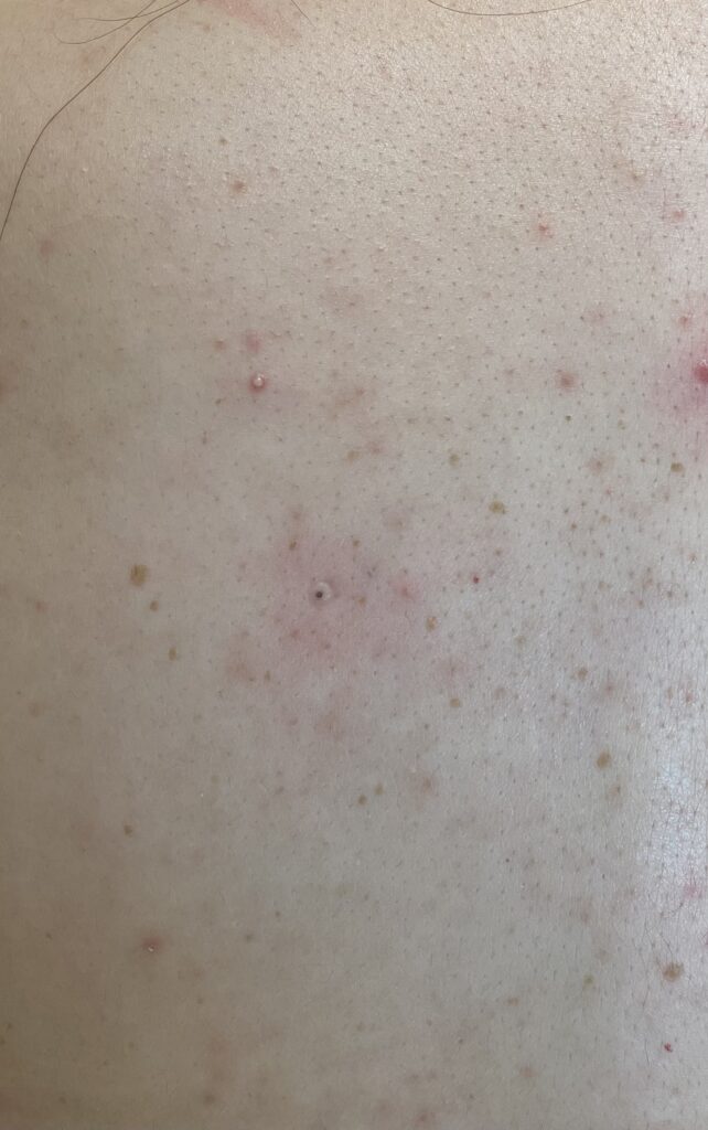 鏡ごしに見て…何が出来ているのか手🖐️で手探り状態になりますね。触るとブツブツしてるとは全てニキビだと思うかもしれません。実は、この背中には、ニキビ(面皰、膿疱)、扁平疣贅のイボまであります。